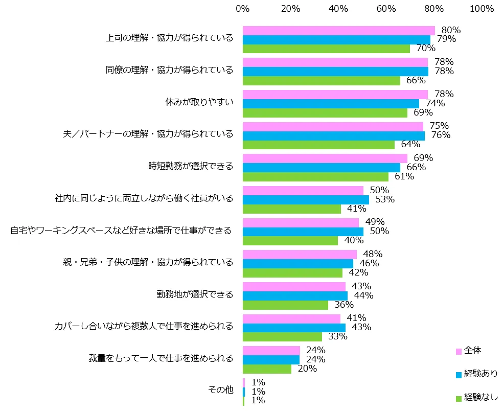 仕事との両立が難しいライフイベントとして「家族の看護・介護」「子育て」「結婚」のいずれかを回答した方に、両立のために周囲に望むことを伺ったところ、第1位は「上司の理解・協力が得られている」(80%)でした。ライフイベントの経験の有無で回答を比較したところ、10ポイント以上差が出たのは「同僚の理解・協力が得られている」(経験あり:78%、経験なし:66%)、「夫/パートナーの理解・協力が得られている」(同:76%、64%)、「社内に同じように両立しながら働く社員がいる」(同:53%、41%)でした。