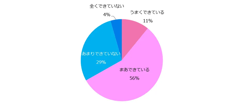 両立しているライフイベントとして「家族の看護・介護」「子育て」「結婚」のいずれかを回答した方に、「うまく両立できていると感じていますか?」と伺うと、67%が「できている」(うまくできている:11%、まあできている:56%)と回答しました。