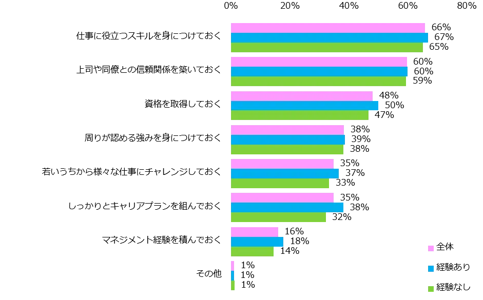 「仕事においてライフイベントを迎える前にしておいたほうが良いことはありますか?」と伺ったところ、第1位は「仕事に役立つスキルを身につけておく」(全体:66%、経験あり:67%、経験なし:65%)、第2位は「上司や同僚との信頼関係を築いておく」(同:60%、60%、59%)、第3位は「資格を取得しておく」(同:48%、50%、47%)でした。