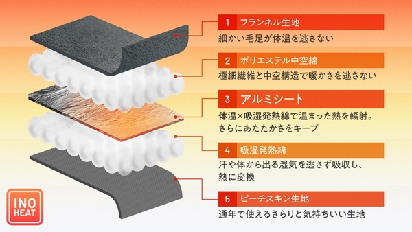 熱を逃がさないアルミシートを中層に配置し、蓄積効果を最大化。5層構造が体温を逃さず、汗や湿気を熱に変えてポカポカが長続きします。体にしっかりフィットする形状で、軽くてても暖かく、冬の夜を心地よく包み込みます。