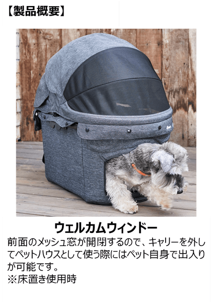本製品は、従来20kgまでだった耐荷重が30kgまで対応となり、中型犬や多頭飼いでも乗せることが可能です。また、メッシュ窓がカゴ部分に2カ所、幌に2カ所の合計4カ所にあり、通気性が高く快適に過ごせます。カートからキャリーを外して使う際には前面のメッシュ窓の開閉ができるので、ワンちゃん自身で出入りが可能となりペットハウスとしてもお使い頂けます。