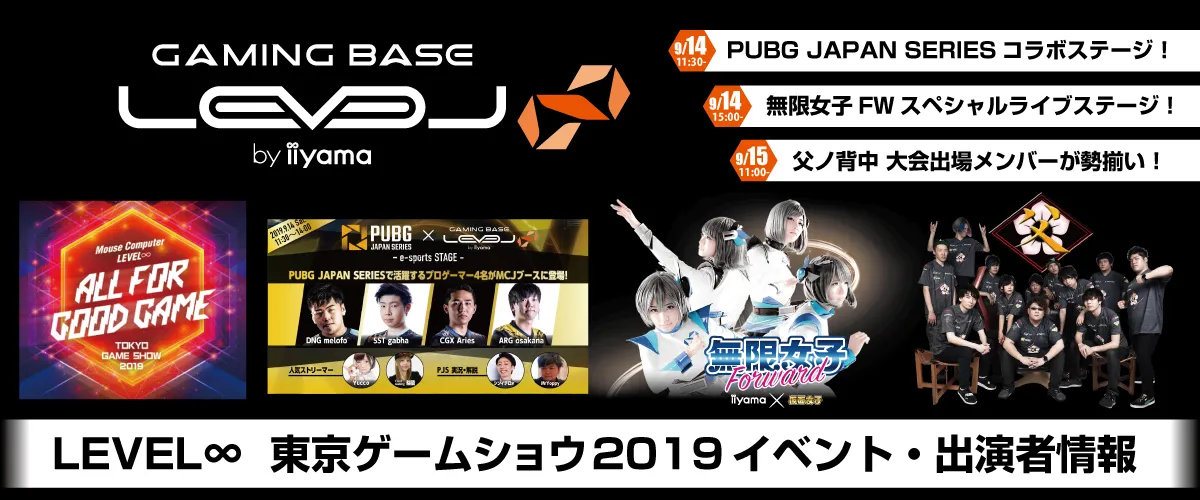 LEVEL∞「東京ゲームショウ2019」でのイベント詳細 出演者情報を公開! 日本最高峰のe-sportsリーグPUBG JAPAN SERIESとのコラボステージ、 「無限女子 Forward ~ powered by 仮面女子 ~」スペシャルステージ、 「父ノ背中」出演のDREAM -R6S e-sports STAGE-