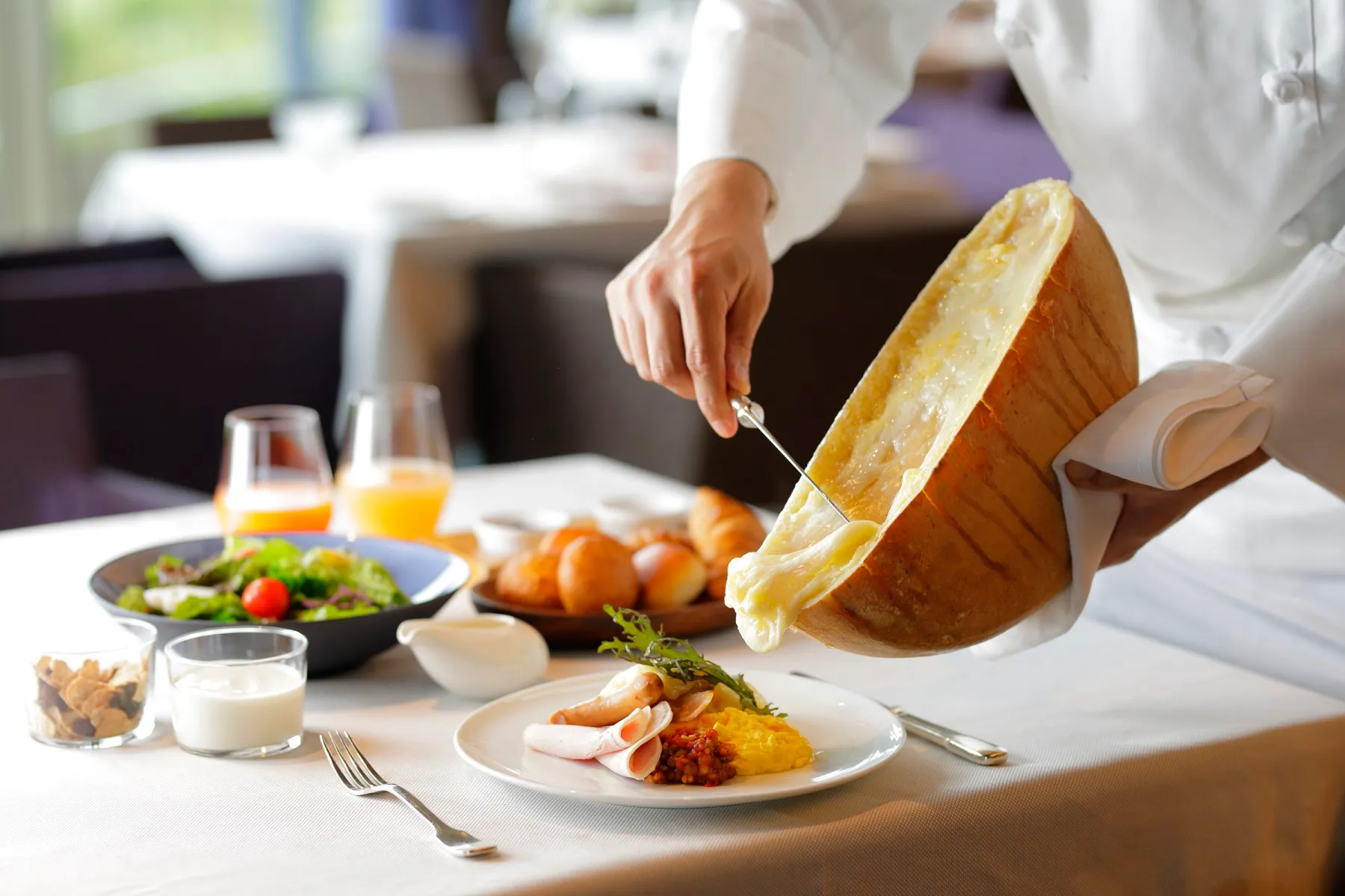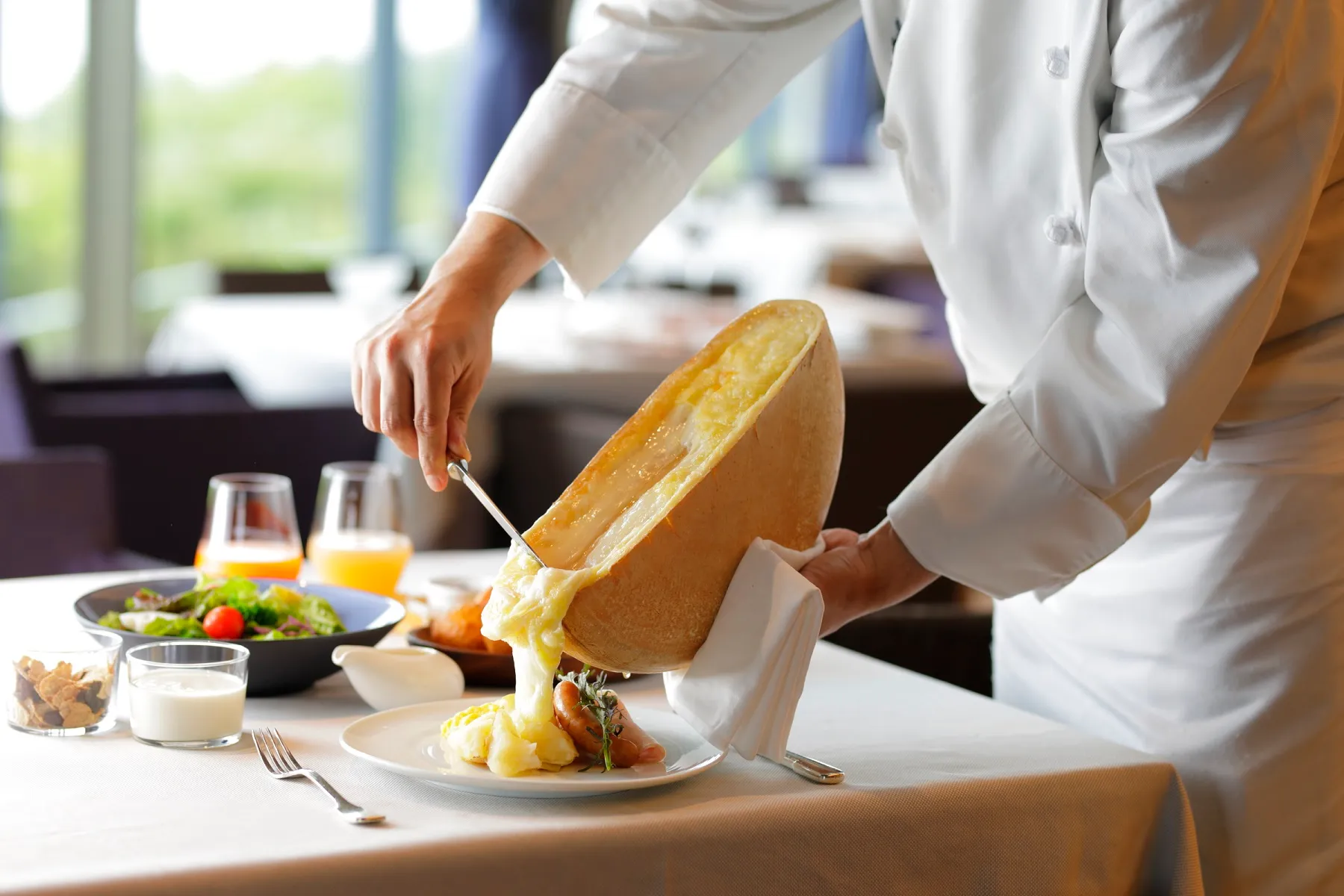 琵琶湖周辺の近江エリアは、気温、湿度など、食品を保存するための技法「発酵」に必要な条件が揃っています。ロテルド比叡では、近江の食材を用いて美味しさを追求している方々と協力し合い、発酵にまつわる食文化体験を提供したく、「発酵ガストロノミー」というプロジェクトに取り組んでいます。とろとろチーズ朝食も、そのプロジェクトから生まれたもののひとつです。比叡山の冬は特に寒さが厳しいため、熱々のラクレットチーズや、オニオングラタンスープを食べて、体を芯から温めてほしいという思いから開発したメニューです。