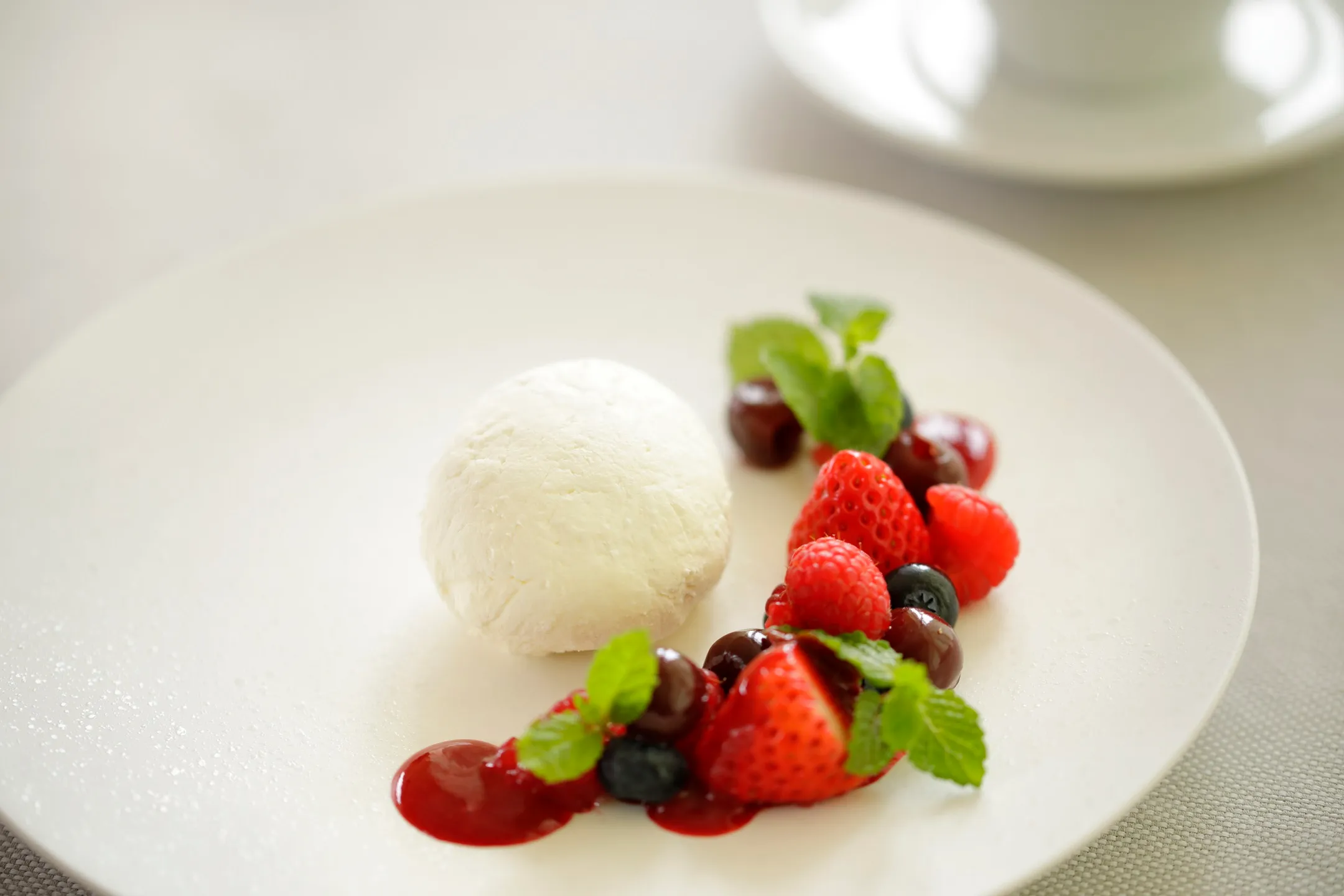 フレッシュチーズであるフロマージュ・ブランを使用したクレーム・ダンジュをデザートとして提供します。フランスのアンジュ地方の郷土料理で「エンジェル(天使)のクリーム」といわれるふわとろなデザートです。イチゴのコンフィチュールをつけて食べると、最高の一品です。