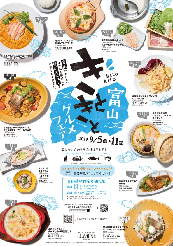 シロエビや紅ズワイガニなど、富山県が誇る海の幸「富山のさかな」が9月11日(水)まで期間限定メニューで楽しめる、「富山きときとグルメフェア」がJR大宮駅に隣接するルミネ大宮の対象レストラン10店舗で開幕しました。