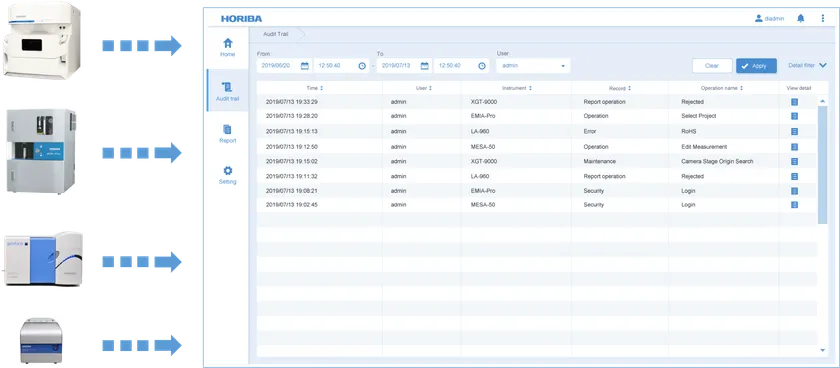 測定、レポート作成、エラーなど各装置から送られてくる操作ログを管理