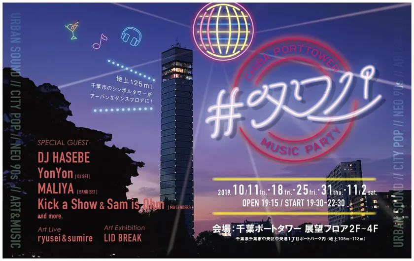 千葉市のシンボルとして市民には親しみ深い千葉ポートタワー。地上125mの高さを誇るタワーの展望フロアを舞台に、現在の音楽シーンの最重要アーティスト/DJをゲストに迎えるパーティーを開催いたします。