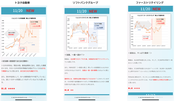 推しカブ10銘柄は、毎週、株価の値動きとともに注目情報を公開しており、決算情報や売上、業績など、企業動向が分かるものから世界の経済情勢まで、どういう情報が株価の値動きに起因するのか等、会員が常に状況をWatchできるようにしている。これは、推しカブユーザへの情報提供と共に、これから株式投資を始めようと思っているStockPoint会員に対しても、自身で情報収集をしていく際の目安にして欲しい。