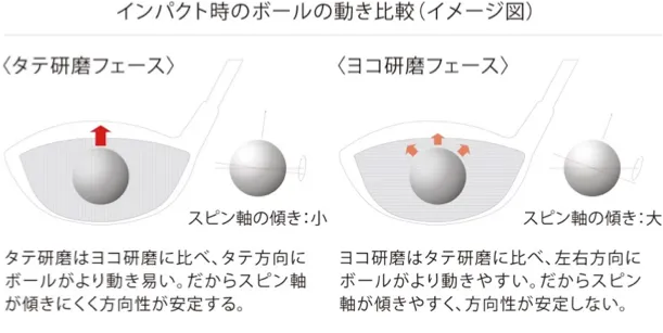 フェース研磨は横研磨が一般的な中、独自の縦研磨を採用。ボールが縦方向に動きやすいため、スピン軸が傾きにくく、サイドスピンが軽減し直進性が向上します。