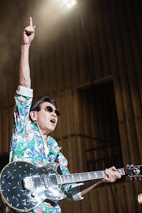 新型コロナウイルス感染予防のため、ソーシャルディスタンス確保の上で開催された高中正義の毎年恒例の全国ツアー“SUPER LIVE 2020”。満員の野音では18:00過ぎて客席から拍手が巻き起こるなど、声など発さなくてもオーディエンスのモチベーションが高い様子は伝わってくる。高中は開演時間5分過ぎて新調したジャンプスーツで登場。“TAKANAKA”のアルファベットを散りばめたヤマハSGを手に登場。乗っけから拳を振り上げて叫ぶテンションのまま、リリース40周年を迎えた「FINGER DANCIN’」でスタート。ホットなドライヴトーンが圧巻で、宮崎まさひろ(ds)、斉藤ノヴ(per) によるリズム隊の応酬もフィーチャーしたバンドアンサンブルが痛快。