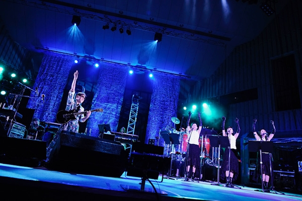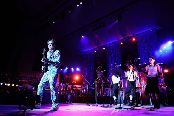 さらに昨年に続きツアーに参加しているAMAZONSの登場に喝采が上がる。おなじみの「渚・モデラート」でムード一変。AMAZONSのソウルフルなハーモニーと艶やかな高中のギターとのデェエットだ。AMAZONSの振付をオーディエンスも客席で踊っている姿も面白い。高中のソロプレイはこの曲を筆頭に、随所でエフェクトを左右にパンニングさせ、会場にギターサウンドが飛び回らせている感覚をもたらした。なお、本公演は日本初、ドルビーアモラスを採用した高音質配信(簡単に言えば映画館レベル)がされており、PC環境で観た人もその音の良さに驚いたのではないか。