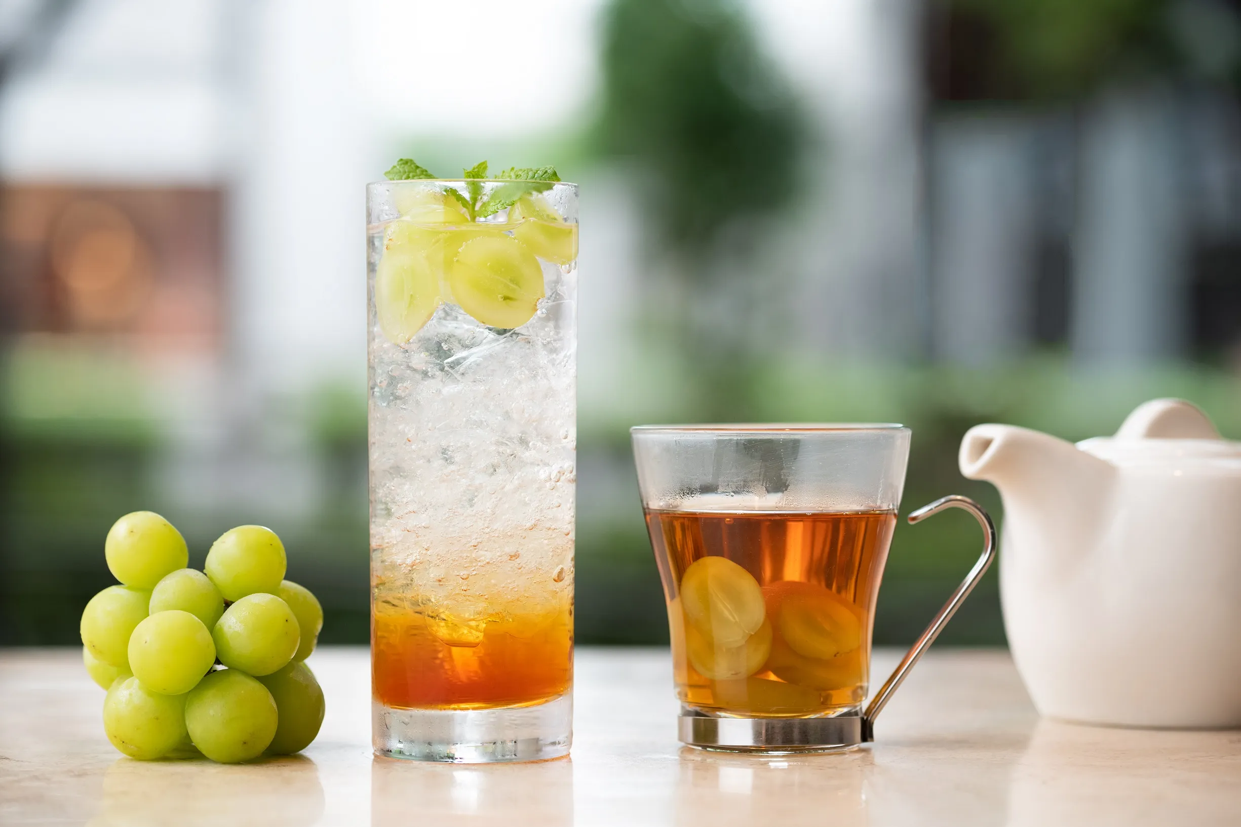 今回のフェアでは、秋の味覚「シャインマスカット」の果実と、香り豊かな「マスカットフレーバーティ」をふんだんに使用し、マスカットの風味を紅茶で最大限引き出したドリンクを2種ご提供いたします。