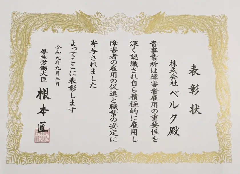 株式会社ベルク(本社:埼玉県鶴ヶ島市)は「令和元年度障害者雇用優良事業所等表彰における厚生労働大臣表彰」を受賞いたしました。