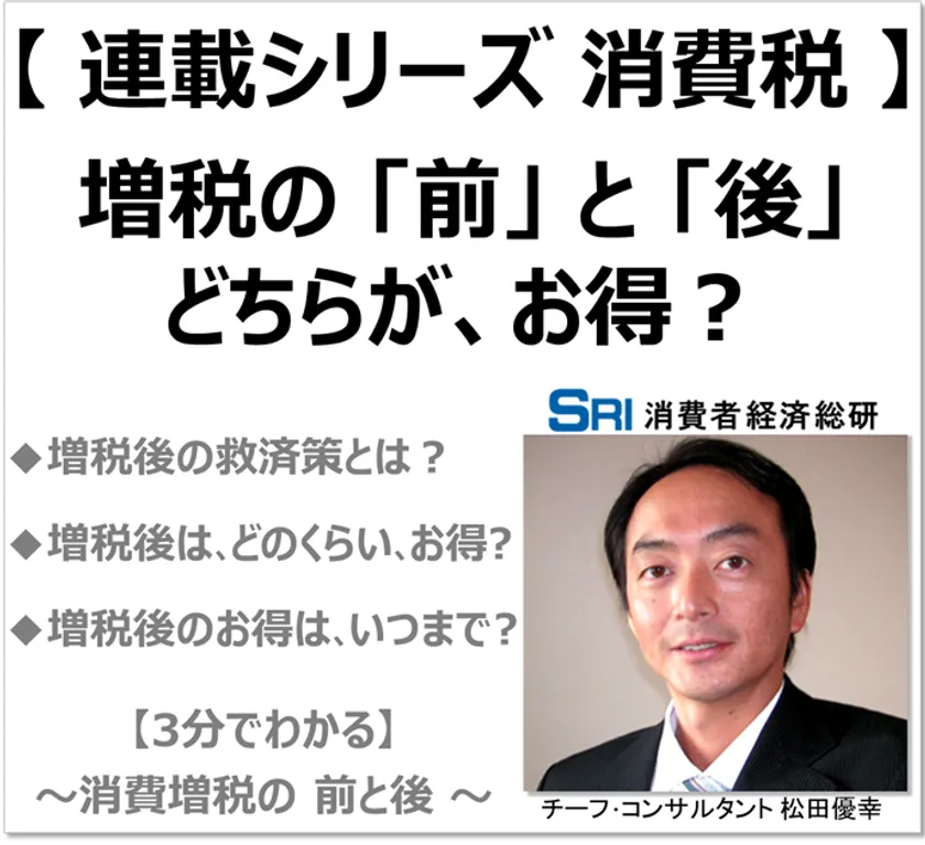 消費と経済を科学する「消費者経済総研」(東京都新宿区、代表:松田 幸治)は、消費増税に際して「消費増税の前・後では、こちらの方がお得!(3分でわかる 連載シリーズ 消費税)」の調査結果を公開しました。