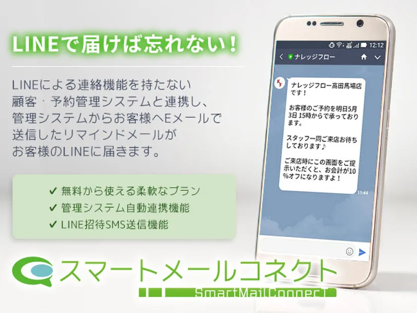 「スマートメールコネクト」は、予約管理システムに、LINEによるリマインドメール機能を付加するサービスです。