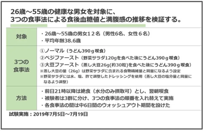 今回の実験では、26歳~55歳の男女12名(男性6名、女性6名)を対象に、3つの食事法として、(1)ノーマル(ぶっかけうどん390g)、(2)ベジファースト(野菜サラダ120gを食べた後にぶっかけうどん390g)、(3)大豆ファースト(蒸し大豆26g/約30粒を食べた後にぶっかけうどん390g)の食後血糖値の推移を比較しました。