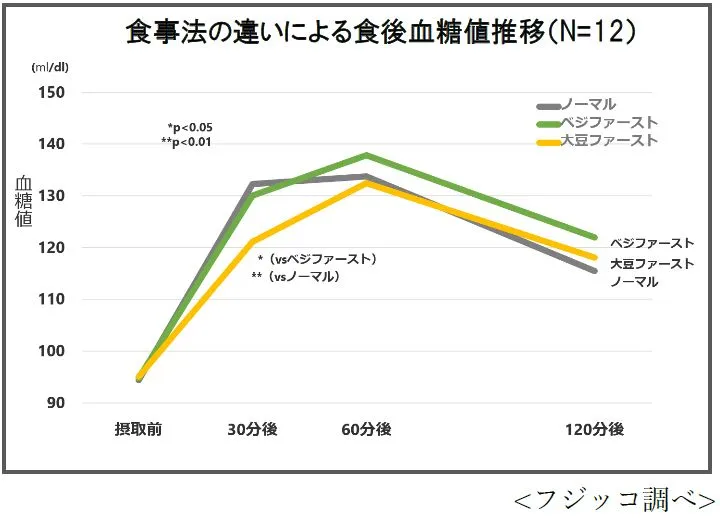 1) 「大豆ファースト」では、うどん摂取30分後の血糖値の上昇を有意に抑制する効果があることがわかりました(グラフ(1))。その効果はベジファーストでは見られないものでした。