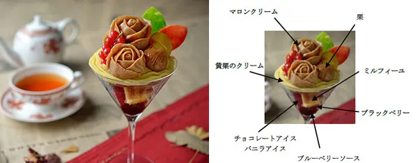 【内容】ブルーベリーソースとバニラ&チョコレートアイス、ミルフィーユとブラックベリーをグラスに閉じ込め、その上にバラに見立てたマロンクリームをのせました。バラ型のマロンクリームの中には、抹茶のババロアが隠されています。