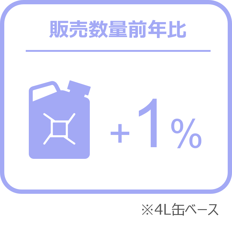 自動車用エンジンオイル販売は、販売量(リットル換算)ベースで前年比24%増と好調に推移した。販売形態別にみると、量り売りは販売量前年比39%増、缶売りは同7%増であった。4L缶の販売は数量前年比1%増で、店頭では同4%増であったものの、インターネットでは同19%減と前年を大幅に割り込んだ。粘度別では最も販売の多い0W-20は数量前年比3%減であったが、0W-16では同22%増、0W-30では同32%増と大きな伸長があった。