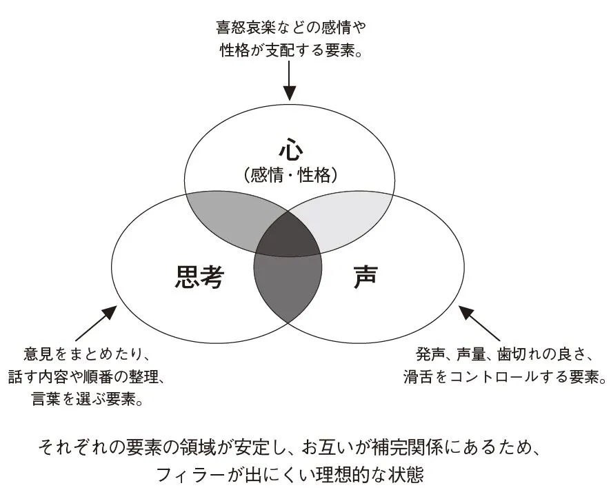 著者の理論も説得力抜群です。フィラーを「心(感情・性格)」「思考」「声」の3つの要素の働きとして解説します。