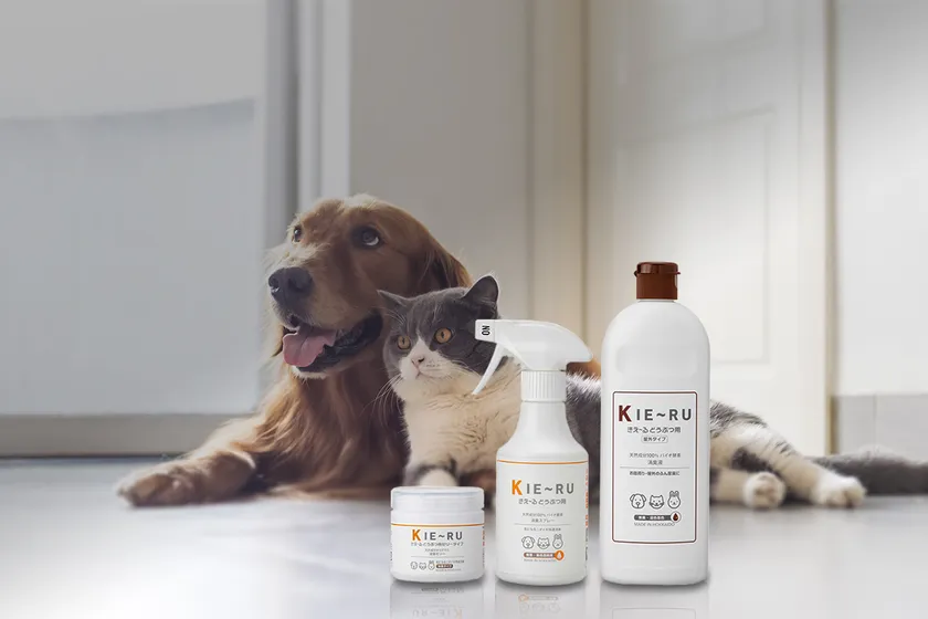 きえ~るUシリーズは消臭液を日常生活に溶け込むようデザインした「バイオ消臭剤きえ~る」のシリーズです。香りでごまかさない消臭液、誰もが使いやすい消臭液、安心・安全な消臭液、水より綺麗な消臭液として、身の回り用、洗濯用、加湿器空気清浄機用、クルマ用を発売してまいりましたが、お客様からペット用のふん尿臭を消臭するシーンでも活用できる商品が欲しいとのお声をいただいていたことから、この度「どうぶつ用」を開発いたしました。