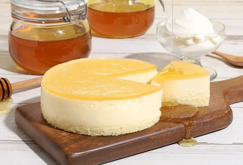 新商品のはちみつフロマージュは、濃厚でなめらかな口どけの良いフロマージュケーキにふわっと香るはちみつジュレをかけて仕上げた富士山ファームでしか味わえないはちみつスイーツです。