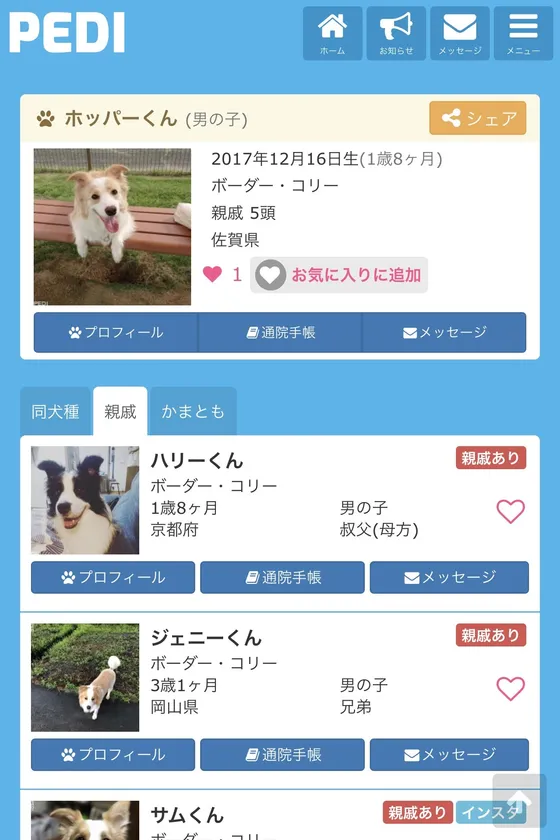 子犬の時期に離れ離れになり、今は遠くで暮らしている子が「うちの子」の親戚だった。そんな偶然の必然とも言える出会いから、飼い主同士の新たなコミュニケーションの場としても広がっています。血がつながっている同士ならではの様々な病気や育て方等の相談など、これまでは飼い主ひとりで悩んでいたこともペディでは親戚の飼い主という心強い相談相手が見つかり、親戚同士のオフ会開催など、出会いはリアルなコミュニケーションへと確実に広がっています。