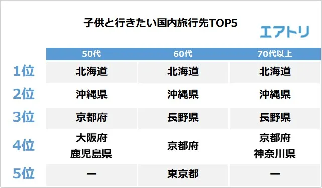 国内は「北海道」「沖縄」、海外は「ハワイ」「アメリカ」が全世代で1・2位を独占。