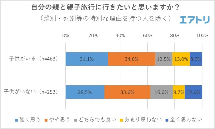 次に、子供の有無で比較してみたところ、子供がいる人の方が「強く思う」「やや思う」と回答した割合が高くなりました。自身が子供を持つことによって、親への感謝が深まり、旅行に連れて行ってあげたいという気持ちが強くなるのかもしれません。