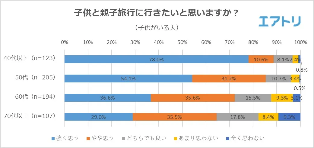 ―40代以下では約9割が「強く思う」「やや思う」と回答。どの世代においても「親と旅行に行きたい」割合よりも「子供と旅行に行きたい」割合の方が大きくなりました。