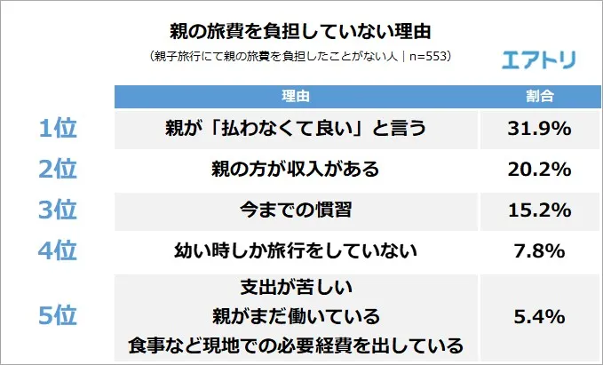 2位の「親の方が収入がある」(20.2%)を大きく引き離して「親が払わなくて良いと言う」(31.9%)が1位となりました。3位の「今までの慣習」(15.2%)と合わせると半数近い人が親の意向で旅費を負担していないことが分かります。やはり親は我が子には甘く、自分のためにお金を使ってほしくないと考えている人が一定数いるようです。