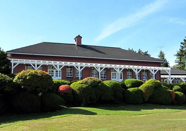 六甲山の開祖、英国人貿易商のアーサー・ヘスケス・グルームが日本で最初のゴルフ場として1903(明治36)年5月に開業した「神戸ゴルフ倶楽部」のクラブハウス。一面のガラス窓と下見板の朱と黒の大きな寄棟屋根のコントラストが美しい。