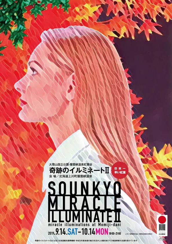 日本最大級の国立公園である大雪山国立公園内にある層雲峡温泉街(北海道上川郡上川町)では、昨年大好評を博した紅葉ライトアップイベントの第2弾「奇跡のイルミネートII」を2019年9月14日(土)から10月14日(月・祝)まで開催します。このイベントでは、層雲峡温泉 紅葉谷の「日本一早い紅葉」を、幻想的な演出とともにお楽しみいただけます。今年はインタラクティブプログラム「もりのおとしもの」も初開催。会場内の幅5m×長さ15mの路面に投影された落ち葉が人の動きに連動し変化するという、大人も子どもも楽しめるデジタルコンテンツを導入し、昨年よりパワーアップした演出で皆さまをお迎えします。