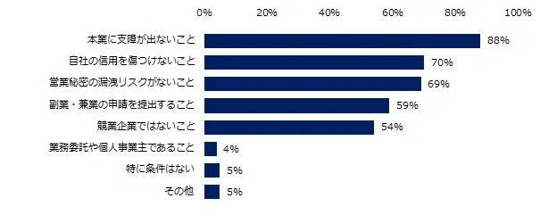 副業・兼業を容認している企業に理由を伺うと、「社員の収入増」(59%)が最多でした。容認条件を伺うと、トップ3は「本業に支障が出ないこと」(88%) 、「自社の信用を傷つけないこと」(70%) 、「営業秘密の漏洩リスクがないこと」(69%)でした。
