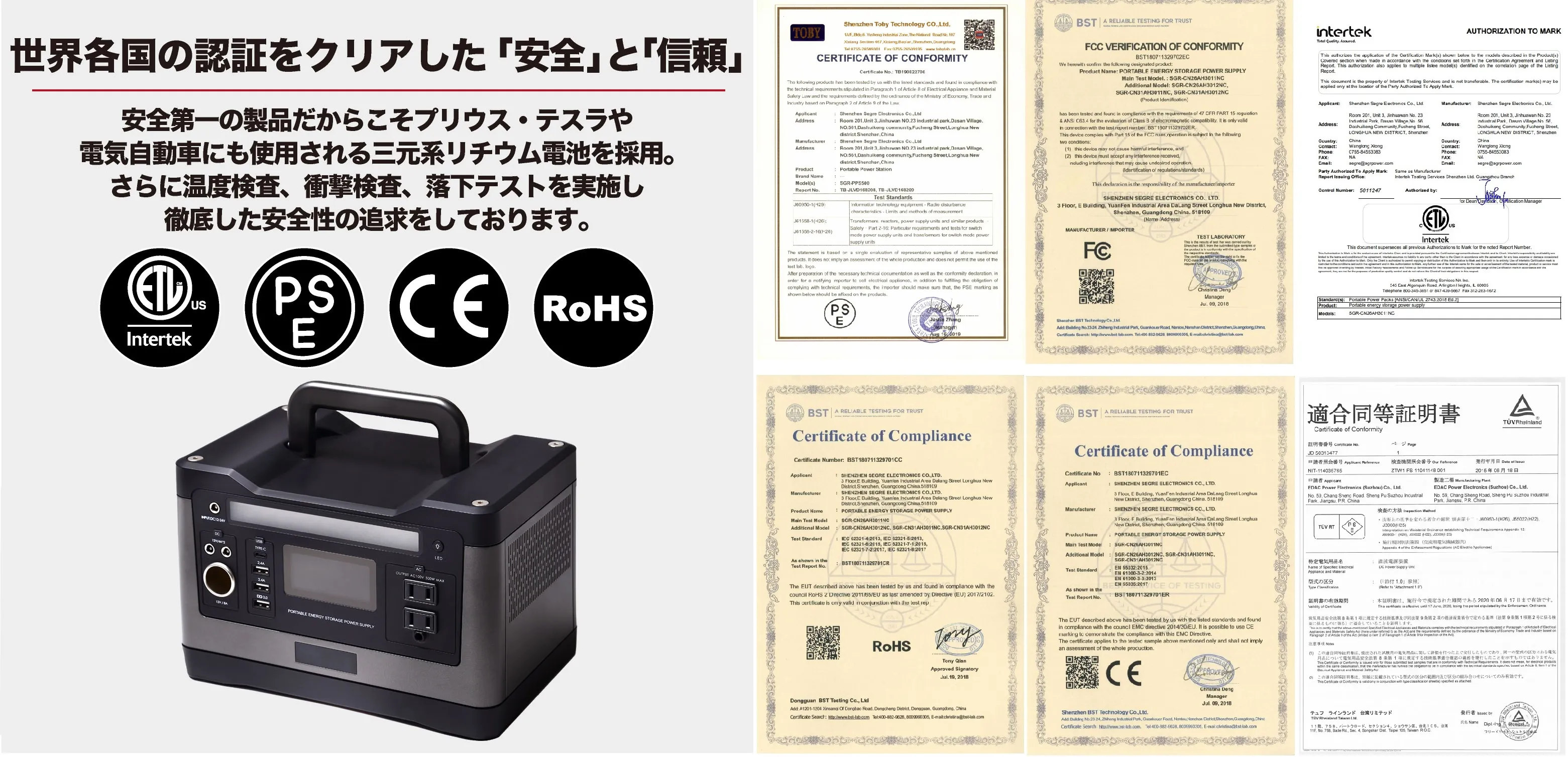国内の技適標準のPSEのみならず、EU連合の技適標準CE・欧米での技適標準のFCC及びETLの認証も取得しております。