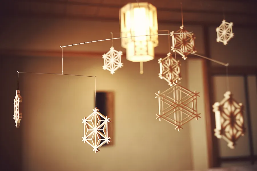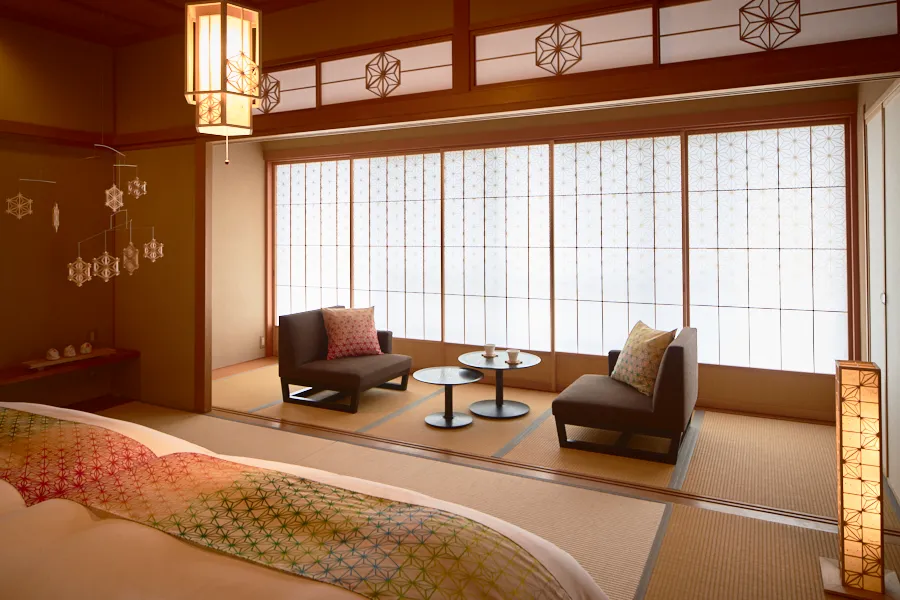1室限定の厄払いルームには、伝統工芸品の鹿沼組子を使いました。35種以上ある模様の中でも魔除けの意味を持つ麻の葉模様の組子をベッドボード、照明、欄間、行灯、床の間の飾り、モビール、コースターにあしらっています。他にもベッドランナーやクッションカバー、障子、を合わせると総数10種の麻の葉文様のアイテムがある特別客室です。また、館内の組子ライブラリーでは麻の葉模様の鹿沼組子を使った自分だけの厄除けアクセサリーを作ることができます。