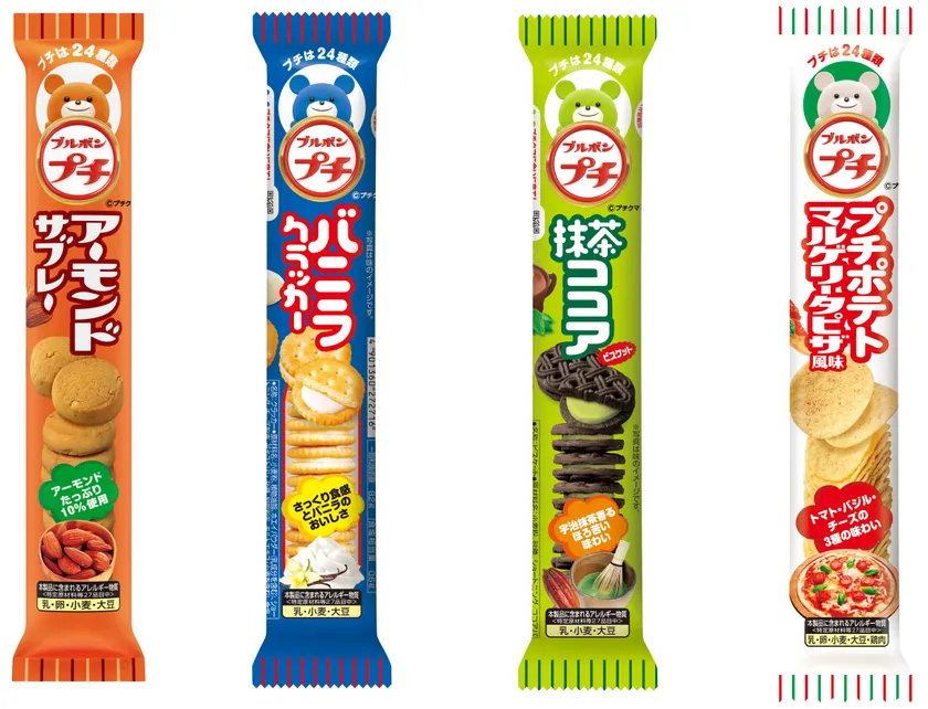 株式会社ブルボン(本社:新潟県柏崎市、代表取締役社長:吉田 康)は、選ぶ楽しさと食べきりサイズで、幅広くご好評をいただいている“プチシリーズ”に「プチアーモンドサブレー」「プチバニラクラッカー」「プチ抹茶ココア」「プチポテトマルゲリータピザ風味」の4品を2019年10月1日(火)に新発売いたします。