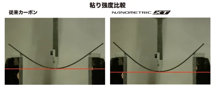 従来のカーボンより高い振動吸収性と強度があり、粘り強いしなりが特徴の新カーボン素材「ナノメトリックXT」。