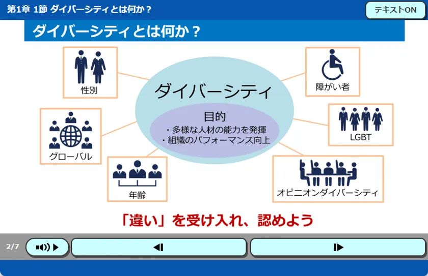 ダイバーシティとは何かを理解し、ダイバーシティの現状と課題を理解します。中間管理職としてダイバーシティマネジメントを実践することができるようになることを目標としています。