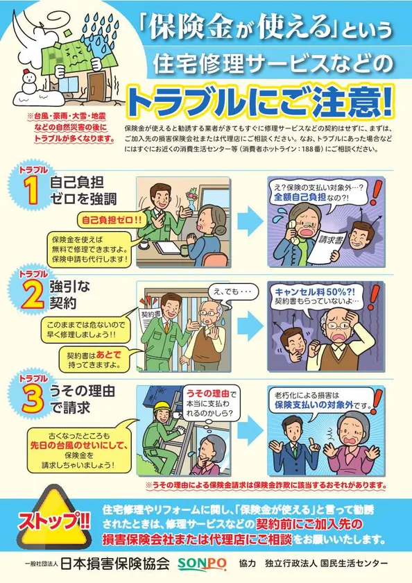 一般社団法人 日本損害保険協会(会長:金杉 恭三)は、「保険金が使える」等と勧誘する業者と保険契約者とのトラブル防止を目的に、独立行政法人国民生活センターの協力を得て、「2019年度版住宅修理サービストラブル注意喚起チラシ」を61.5万部作成し、住宅修理サービストラブルに対し注意喚起します。