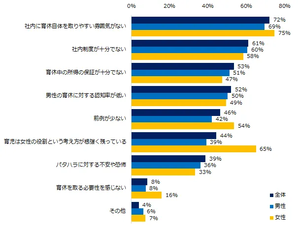 「男性の育休取得率が低い理由は何だと思いますか?」と伺ったところ、72%が「社内に育休自体を取りやすい雰囲気がない」と回答しました。男女別に見ると、男性の第2位は「社内制度が十分でない」(60%)、第3位は「育休中の所得の保証が十分でない」(51%)でした。女性の第2位は「育児は女性の役割という考え方が根強く残っている」(65%)、第3位は「社内制度が十分でない」(58%)でした。