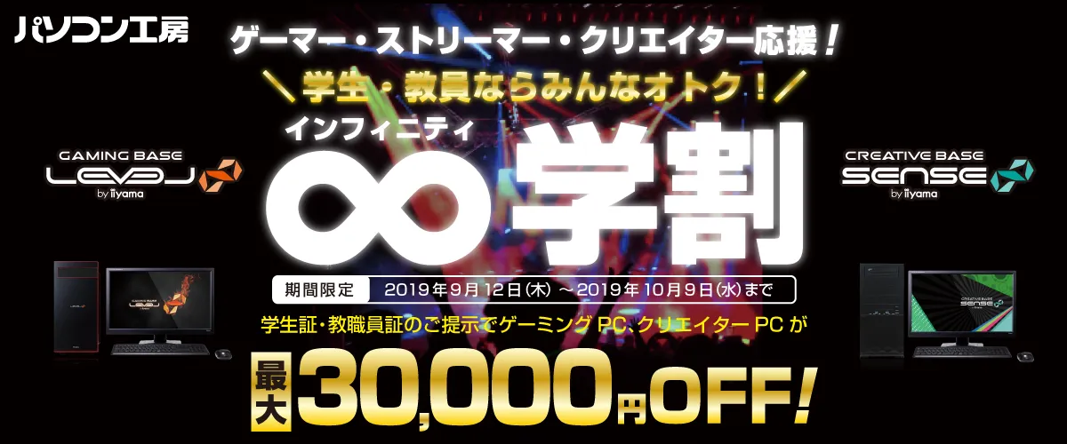 ゲーマー、ストリーマー、クリエイターを応援! ユニットコム「東京ゲームショウ2019」への出展を記念して、 学生・教員ならゲーミングPC、クリエイターPCが 最大30,000円(税別)OFFになる学割キャンペーン 「∞(インフィニティ)学割」をパソコン工房でスタート