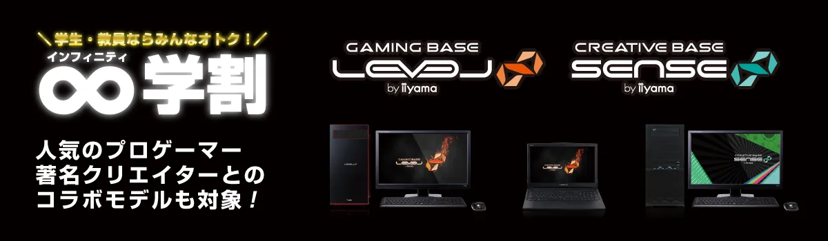 世界的なオンラインゲーム人口の拡大と熱狂を背景に、最新のゲーミングPCやクリエイターPCを通じて、PC環境の向上と、学生及び教員の技術・技能の向上を応援します!より多くのゲーマー、ストリーマー、クリエイターが活躍することを期待し、学生・教員の方を対象にした学割キャンペーン「∞(インフィニティ)学割 」を開催いたします。