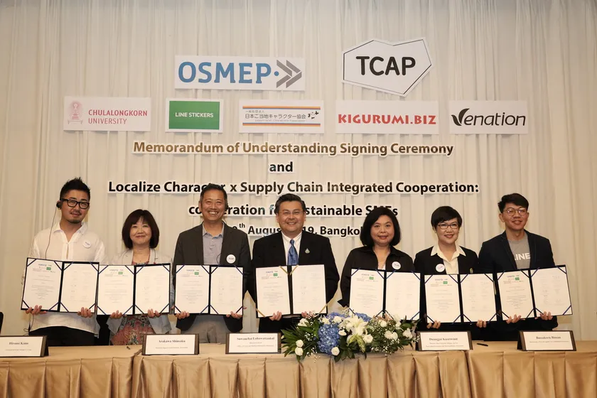 今回の国際交流イベント・セミナーでは、タイ中小企業振興庁(OSMEP)の呼びかけにより、交流協定(MOU)の締結が実現。日本とタイのクリエイティブ業界で活躍する6団体が調印式に出席し、ローカルキャラクターの推進を目指すタイ中小企業振興庁(OSMEP)と交流協定を結びました。