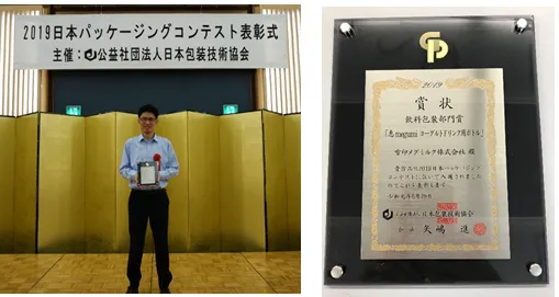 今回、受賞した「飲料包装部門賞」は、包装部門賞の中の13賞のうちのひとつで、各部門の包装合理化・改善等に貢献したパッケージに贈られる賞です。