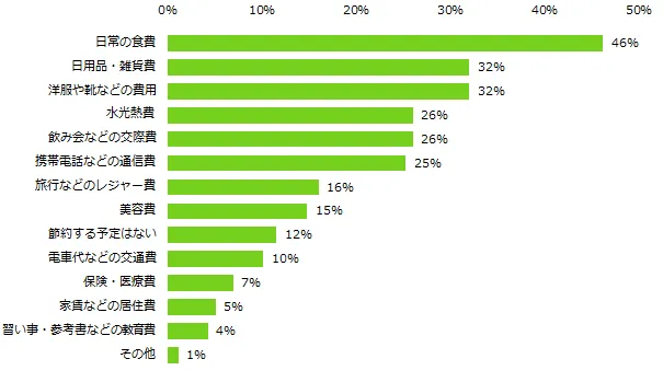 第2位は「日用品・雑貨費」(32%)でした。「それがなくてもいいのに、衝動買いすることが多かったので、そういうことはやめたい」(33歳女性)、「無駄遣いをしないで、本当に必要なものかを考えるだけで、節約になる」(36歳男性)など、食費とは異なり、無駄な出費を減らす考えの方が多いようです。