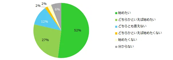 「増税をうけて、収入を増やすためにバイトを始めたいと思いますか?」と伺ったところ、79%が「始めたい」(始めたい:52%、どちらかといえば始めたい:27%)と回答しました。