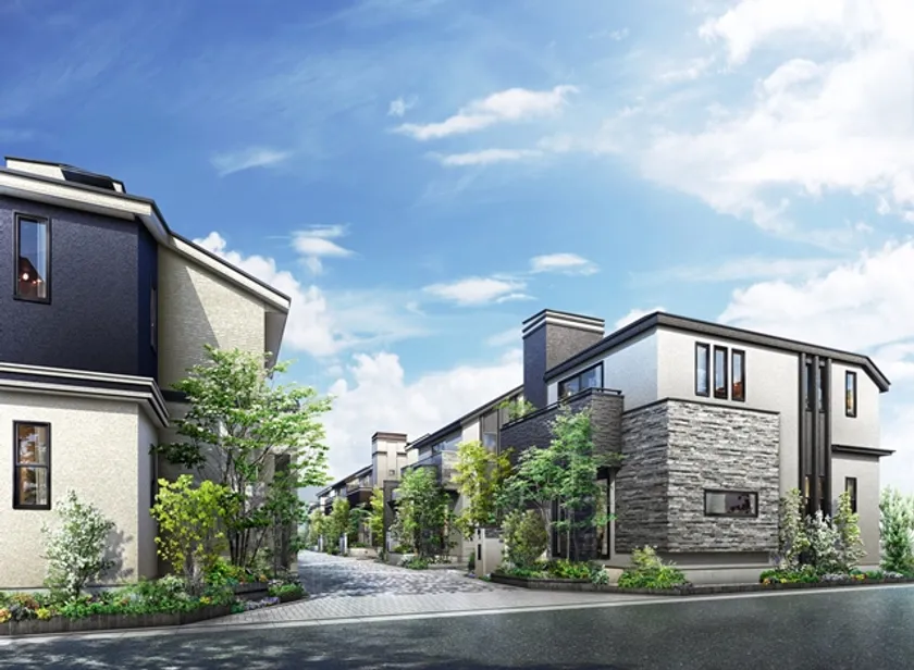 本物件は、ウルトラマン商店街から程近い閑静な住宅街にある約2,400m2の敷地を開発して誕生します。「悠久の邸宅」をコンセプトにモダンでスタイリッシュなデザインを採用し、建物の外観には切石素材やタイルを使って重厚感を演出しています。外構には大型の門塀やコーナーウォールを組み合わせ、立体感を感じさせるプライバシー性の高いセミクローズ外構を取り入れました。また、デザイン性の高いインターロッキング舗装の開発道路に連続したデザインを取り入れたカーポートを組み合わせ、1邸1邸が美しく調和し洗練された街並みを創出しました。