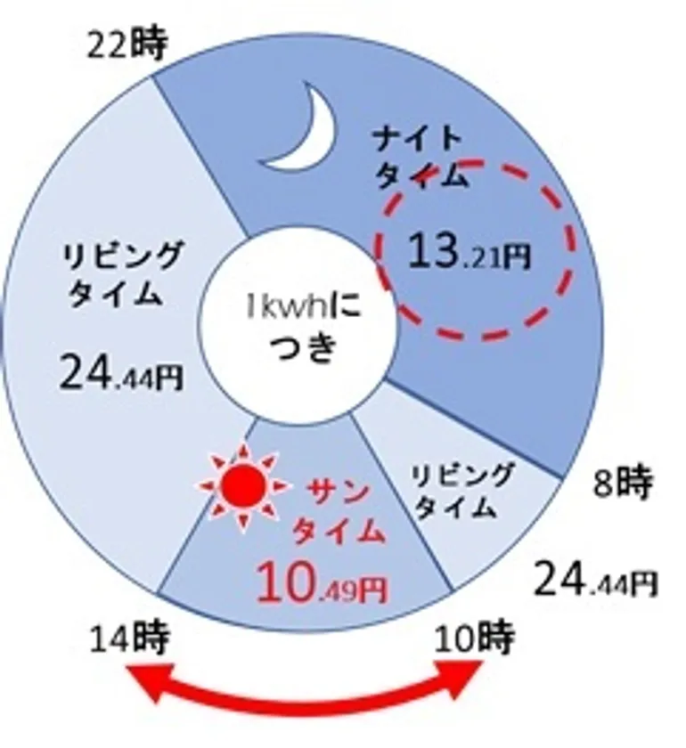 サンタイム(10時~14日)に給湯器を稼動雨天時も安価な料金設定で安心エコキュートの自家消費を促します。