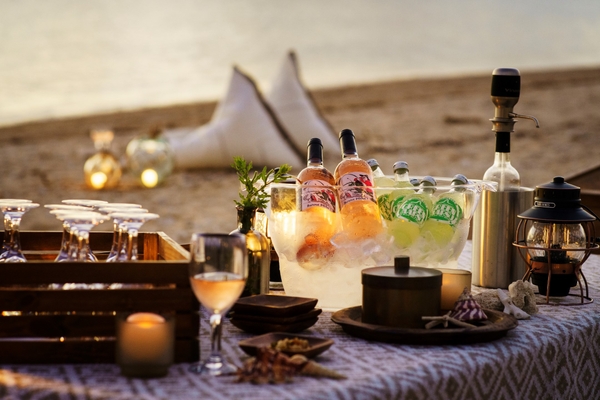 ハーリーの日に、人々が港に集まり酒を酌み交わしていたという古事にちなみ、星のや沖縄の前の浜辺に夕陽を眺めながらアペリティフを楽しむスペースが登場します。伝統漁船のサバニをドリンクカウンターに見立て、美しい色合いの食前酒を揃えました。海や空を染める夕焼けのようなオレンジワイン、薄雲にかかる夕日がつくるピン色の空のようなロゼワイン、夕日にきらめく水面のように琥珀色が美しい、樽貯蔵の泡盛でつくるハイボール。グラスの中にも広がる夕景が楽しめます。サバニの周りには、漁網のブイに使用していたガラスの浮き球を使った照明が灯り、夕刻は幻想的な雰囲気に包まれます。水平線に沈む夕陽と空の色の移り変わりを、心地よい風の中で優雅に眺められます。